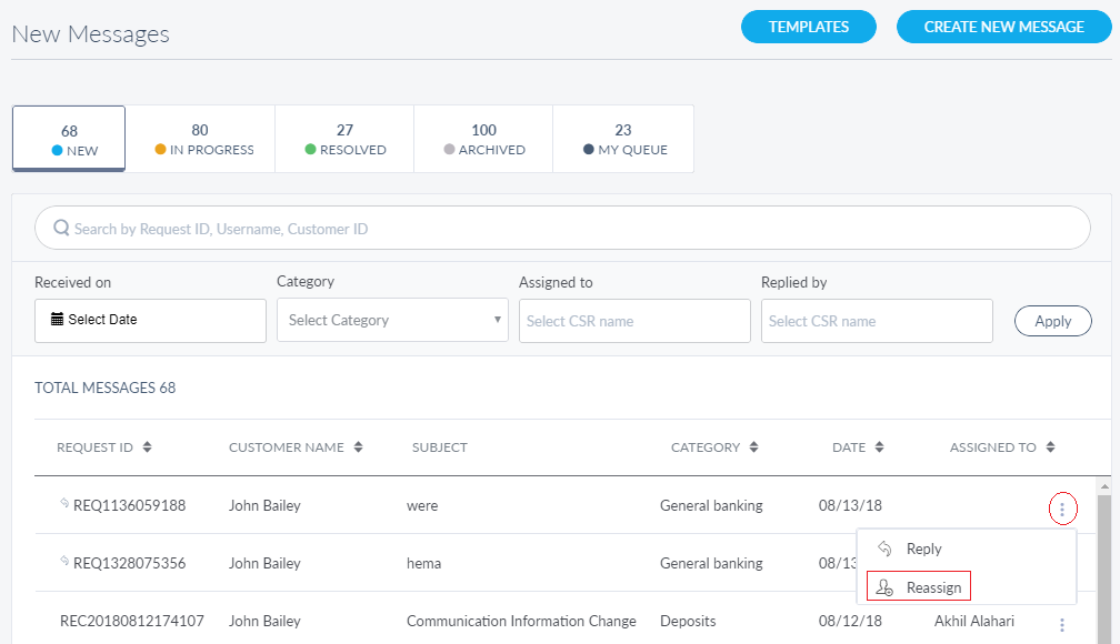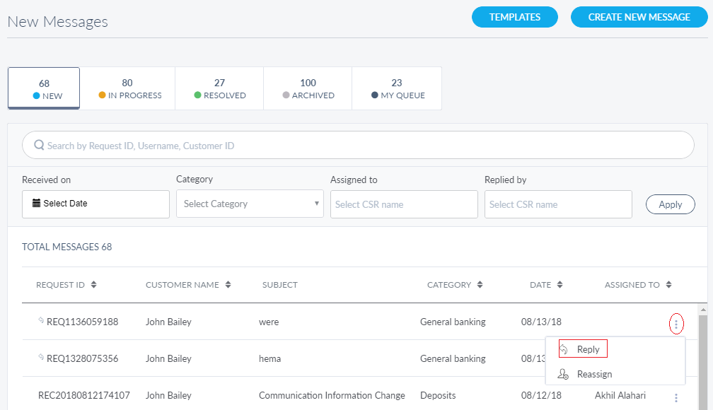 The messages list in New, In Progress, Resolved, and Archived tabs are represented as rows with the following details: Request ID, Customer Name, Subject, Category, Date and Assigned To. The rows in the message list in My Queue tab are similar to other tabs except for the Status details instead of Assign To details.