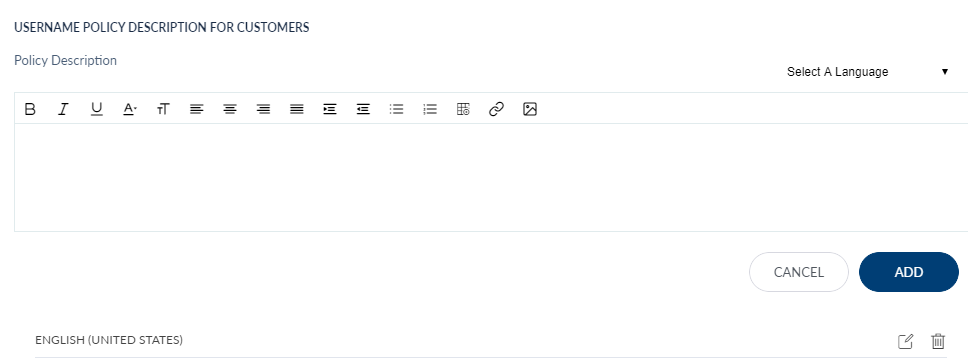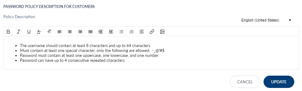 An administrator can edit the username and password policies and descriptions. Please note that an administrator is required to select the edit option available in each section (username and password) for making changes for that section.