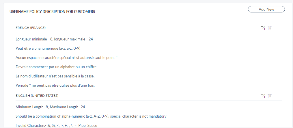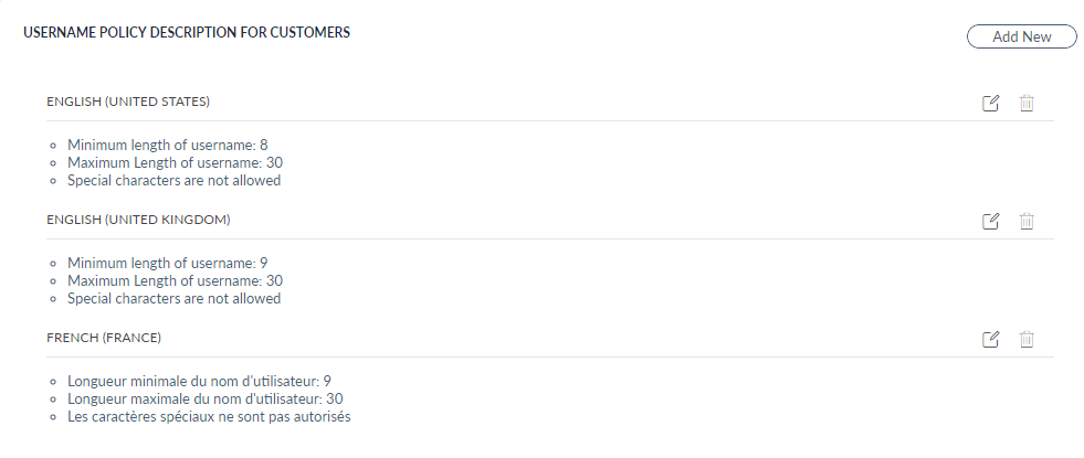 The Username Policy Description section displays the created policy descriptions for the username policies. The policy descriptions are displayed in the selected language.