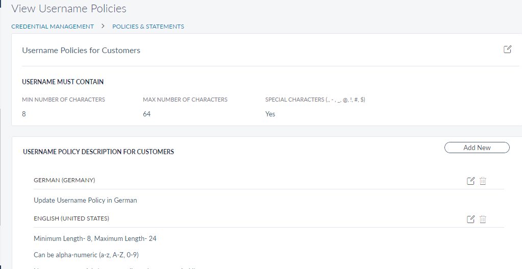 • Click Edit  beside Username Policies for Customers. The Edit Username Policies screen is displayed.