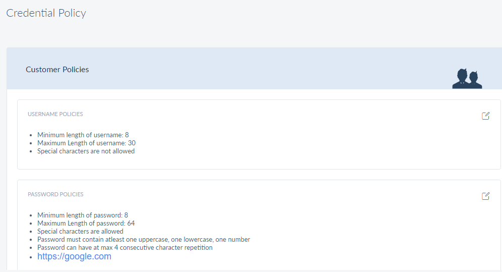 • Click Edit  beside username policies for customers, to edit a username policy.