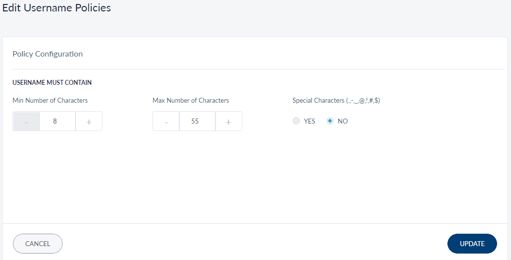 • Special Characters: Select 'Yes' or 'No' to allow customers to include special characters while creating a username.