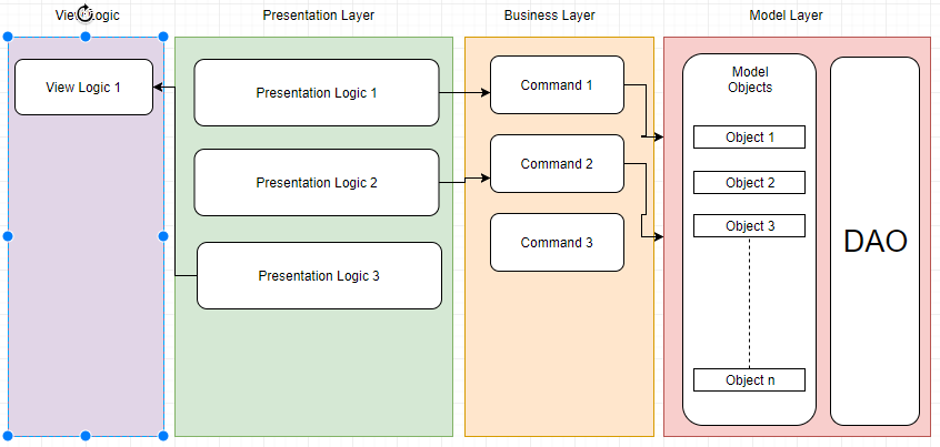 - It is a layered architecture, which has a common model layer, a business layer with many commands, and a presentation layer. The loose coupling between the layers can help this process.