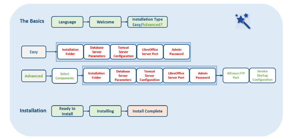 - Advanced: Manually select server port numbers, service properties and third-party components before installing Alfresco.