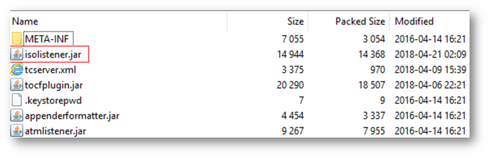 - Amend the MANIFEST.MF file under tocfee.ear>tocfplugin-ra.rar>META-INF and tocfee.ear>tocfplugin-ra.rar> tocfplugin.jar>META-INF to include the name “isolistener.jar” (without quotes).