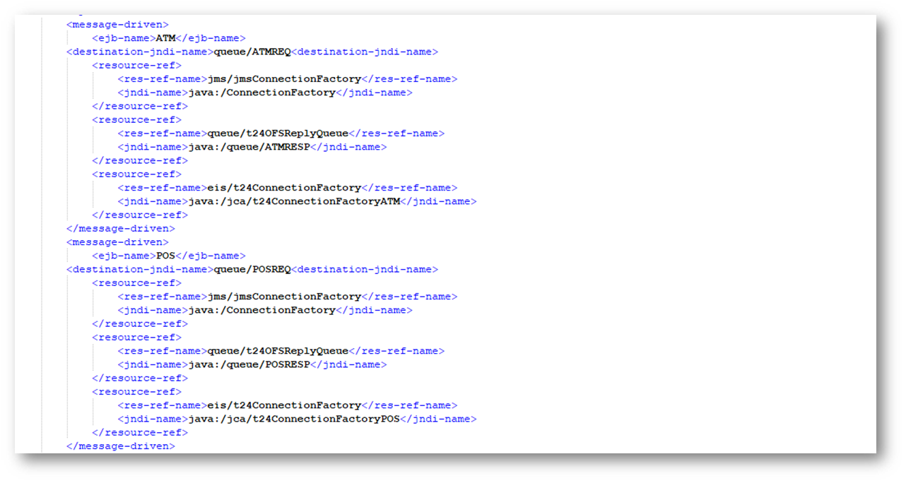 - Copy the tags from <message-driven> to </message-driven> and edit the values as highlighted below for ATM, POS.