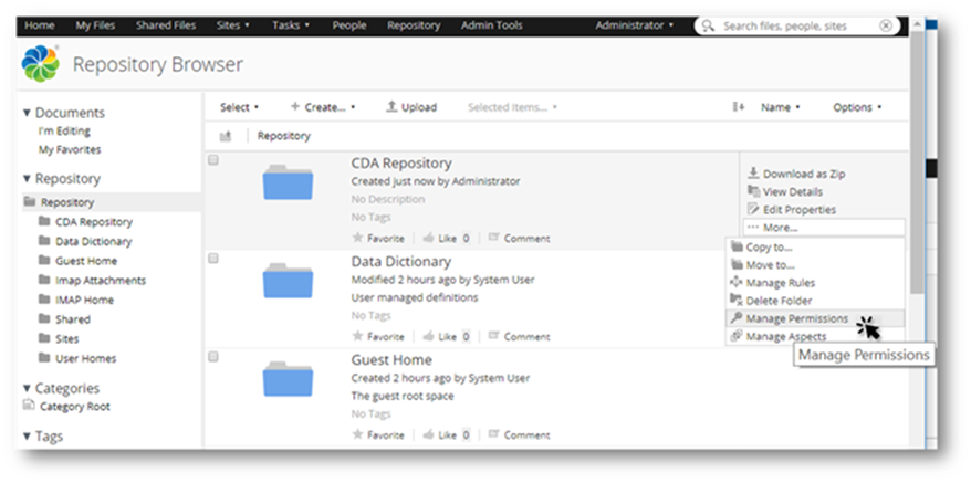 Now the CDA repository folder is created in Alfresco repository.