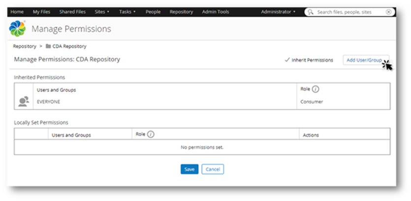 In order to use the CDA project to define new articles you will need to modify the permissions for the project folder directly on the Alfresco server to correctly setup the CMS user roles to create (contributor or collaborator) and publish (coordinator) content. In the example below there is only 1 role (admin) that has the coordinator role assigned.