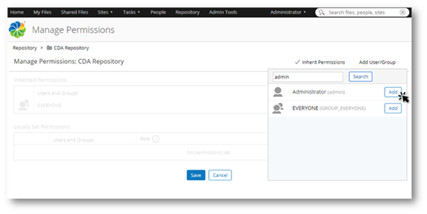 - Enter admin in the Search window to bring up the correct user role (Administrator) then click on the Add button.