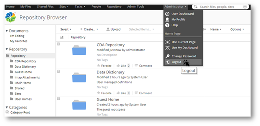 - Select the Administrator menu and click on the Logout button to close the Alfresco Administrator dashboard.