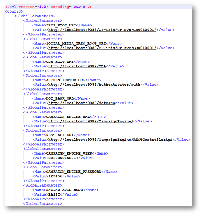 The config.xml file (located in DEP » conf folder) contains all the global variables that are loaded when the application server starts.