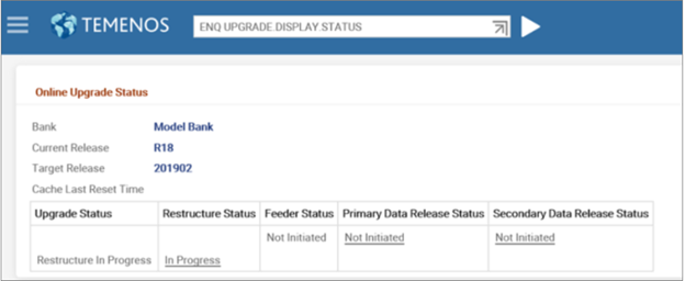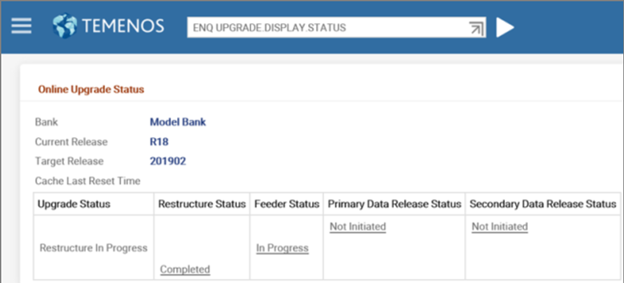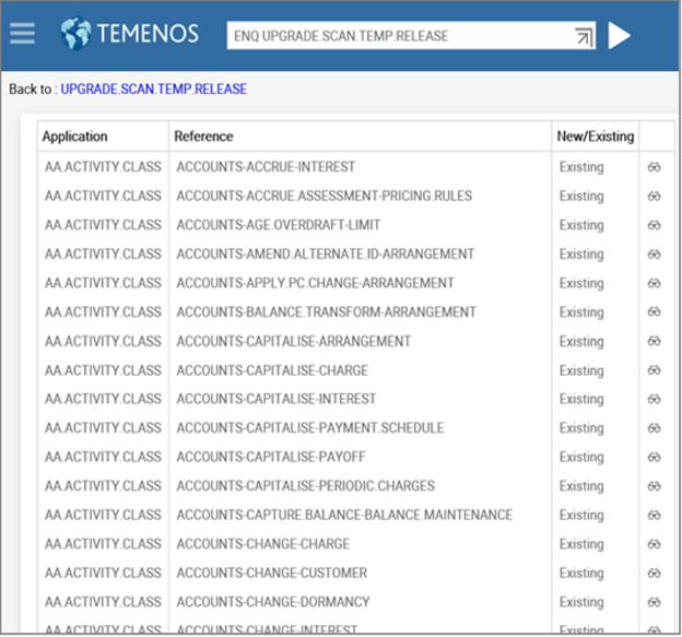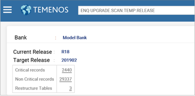 This section discusses about the enquiries that helps you to scan the Temenos Transact release pack (TEMP.RELEASE), so that you can identify the critical and non-critical data items of the new software release. You can also use these enquiries to monitor the online upgrade status.