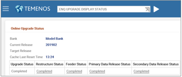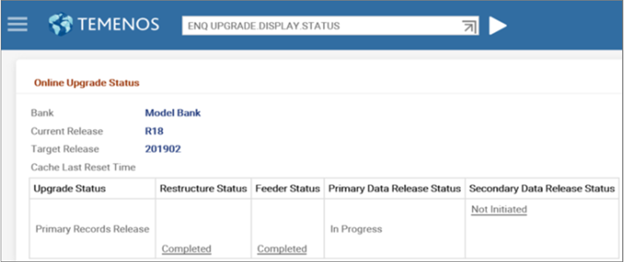 - After the release of primary data items, Primary Data Release Status changes to Completed and Upgrade Status changes to Secondary Records Release. This initiates the T24.UPGRADE service.