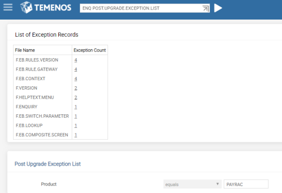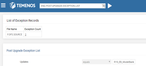 The POST.UPGRADE.EXCEPTION.LIST enquiry fetches all the data items released through online upgrade and module installation, without any selection criteria.