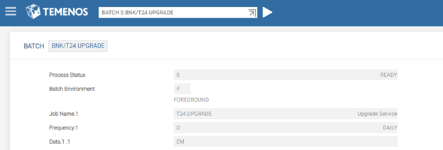 - Add the product in the Data field of BATCH record, which is associated with the upgrade service (for example, BNK/T24.UPGRADE).