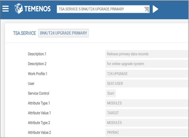 - Commit the T24.UPGRADE.PRIMARY service to release the primary data of these Temenos Transact products.