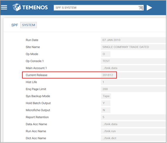 - You can see the updated SPF SYSTEM record with the Current Release field value as 201812 and Online Upgrade field value as PRIMARY.UPGRADE.COMPLETED. The cache reset period value is updated and moved to the Last Cache Reset Period field by T24.AUTHORISE service because once the Temenos Transact system becomes online, the re-connected sessions can reset cache only once per session and need not repeat cache reset every day.