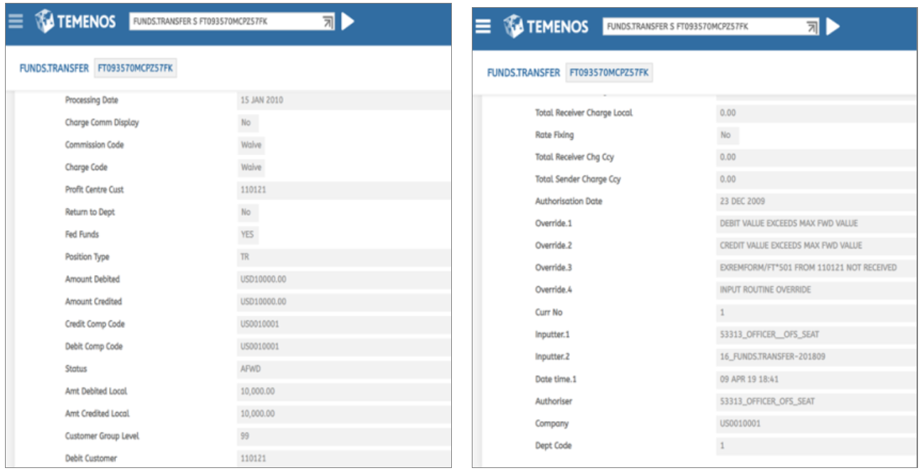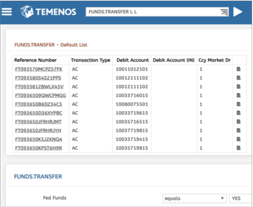 The below FUNDS.TRANSFER-201809 example shows you the list of data items from corresponding table that are restructured according to the criteria defined in restructure definition.