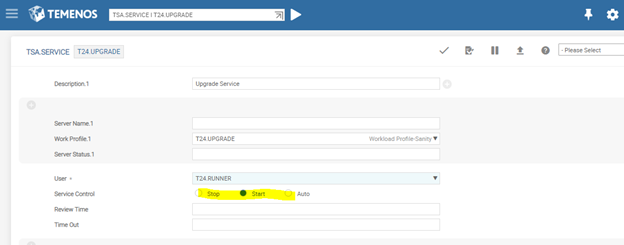 - Select Start in the Service Control field for both TSM and T24.UPGRADE.