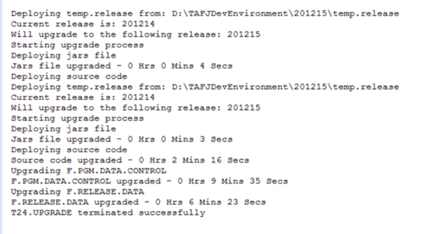 DBtools –u t24user –p password –cf tafj.properties –s –log tmprelease TEMP-RELEASE C:\T24Upgrade\201812.TAFJ201812.1.temp.release\temp.releaseC:\UTP\R18DEV\Temenos\t24home\default\JARS –bp C:\UTP\R18DEV\Temenos\t24home\default\BP