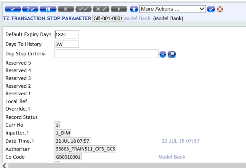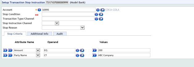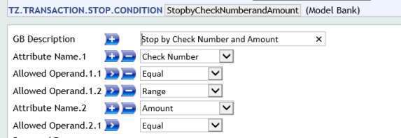 - TZ.TRANSACTION.STOP.CONDITION – This can be used when the bank wants to impose limitations on the stop criteria, which can be captured by the user. For example, stop by cheque number and amount.