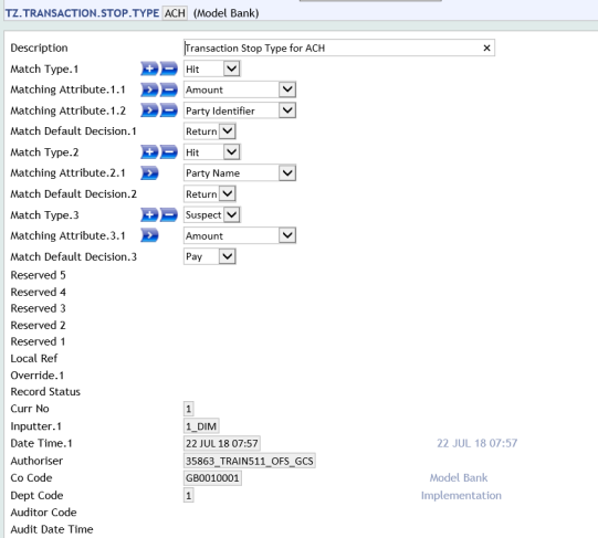 - TZ.TRANSACTION.STOP.TYPE – It allows the bank to define stop types (usually per source or channel) and specifies various match type rules which meet the stop instruction. For each match type a decision on how to handle the transaction is specified. The transaction can be either returned or paid but an investigation process is triggered for the user to confirm the system decision.