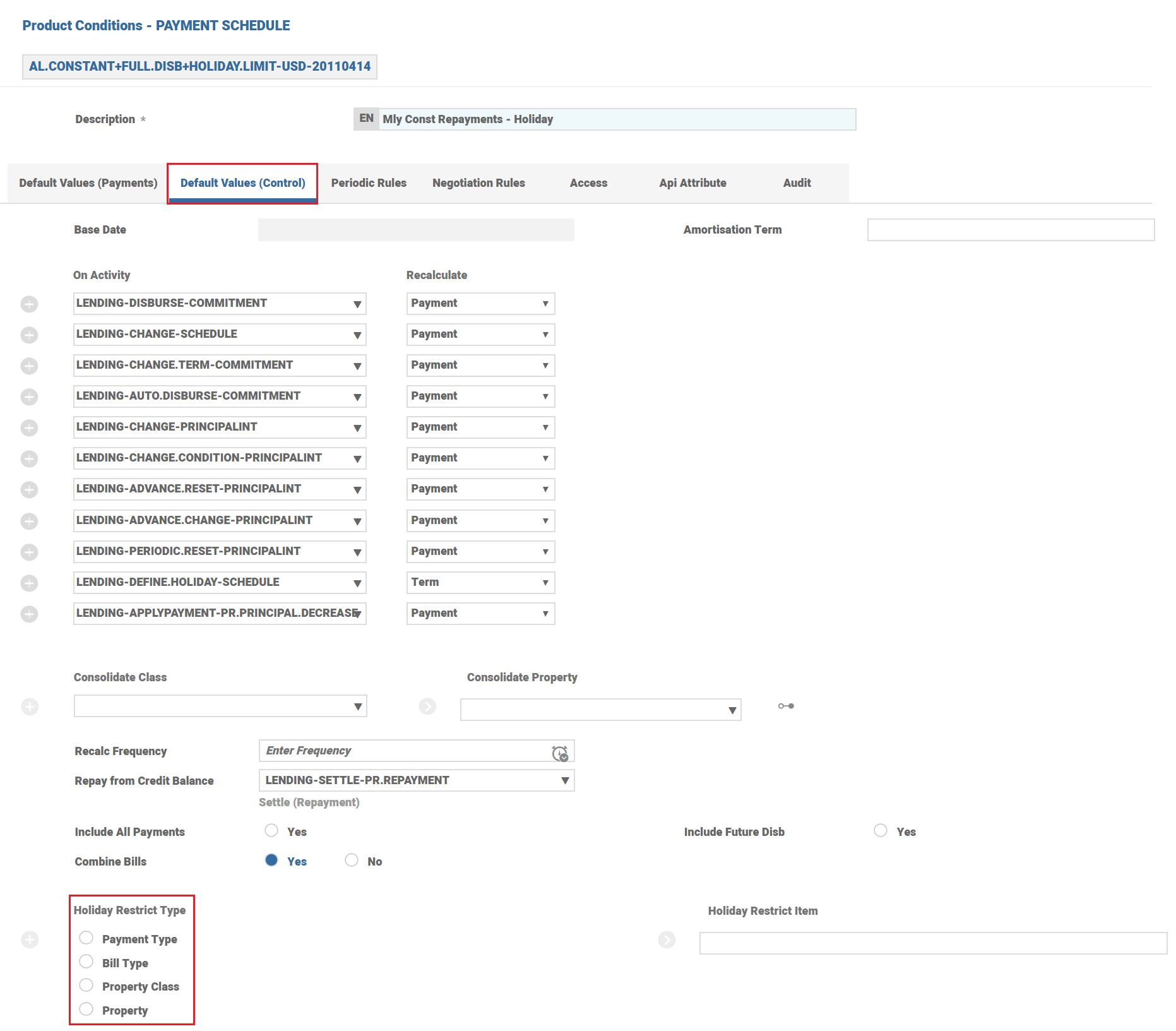 | Hol Payment Type | This field the type of payment for which the holiday processing should be considered. This must be a valid input from AA.PAYMENT.TYPE. This can be inputted only when the Hol Start Date and the Hol Num Payments are defined. Else, this cannot be input. |