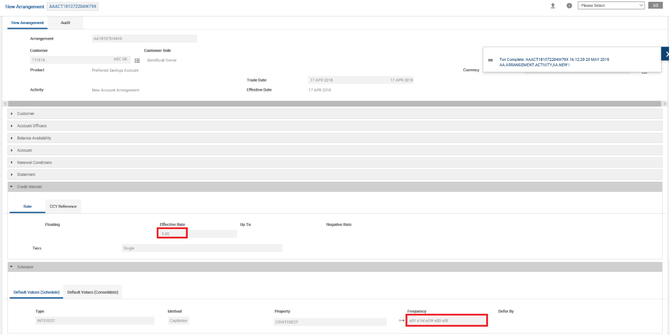 When a savings account is opened based on the above setup, the APR is arrived at 2.52 and presented in the arrangement overview.