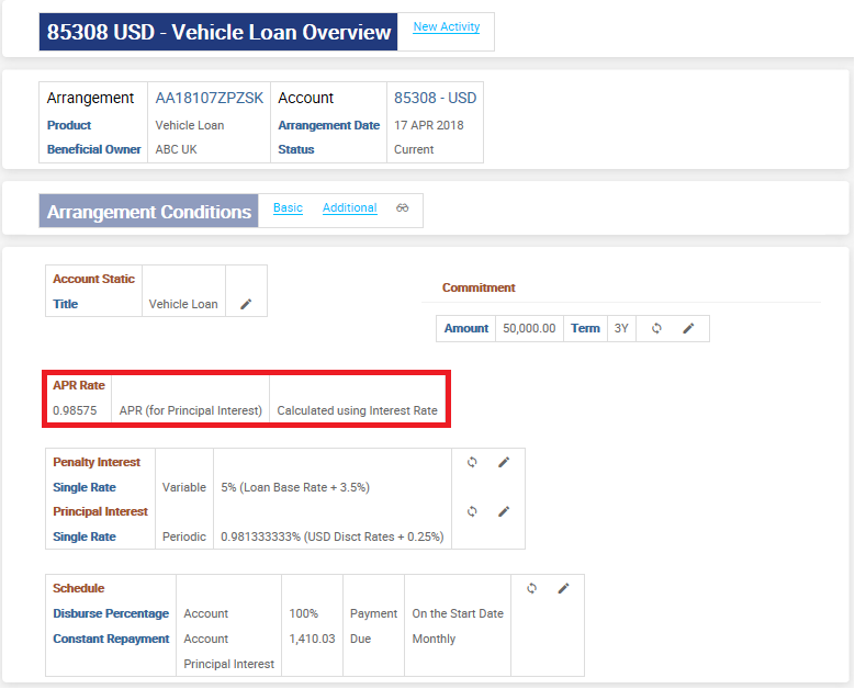 When a personal loan arrangement is opened for a customer with teaser or promotional rates for an initial period similar to the above illustration, the final APR arrived from the combined weighted average interest is calculated and displayed on the arrangement overview.