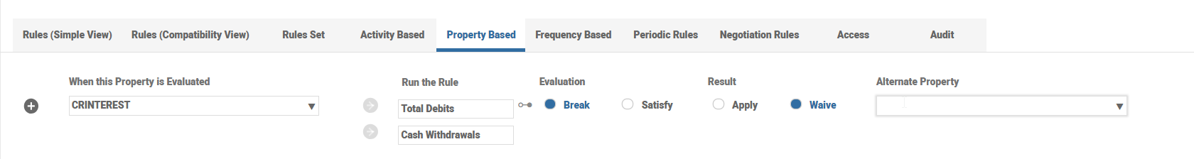 - It is possible to apply a rule while evaluating a Property (as part of schedule processing of Interest or Charge). If satisfied or broken, the system waives or applies the Property or an alternate Property accordingly.