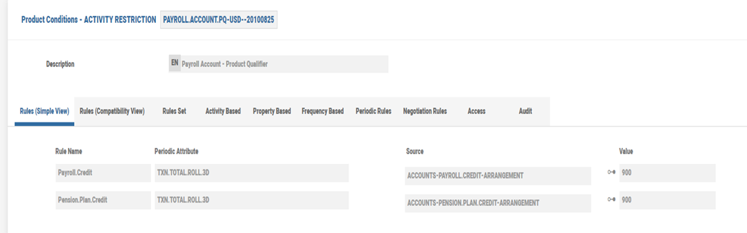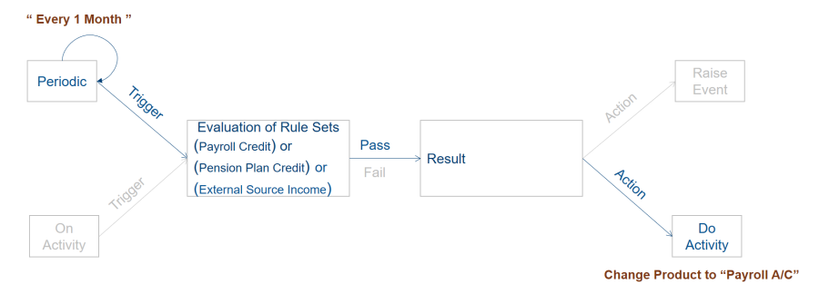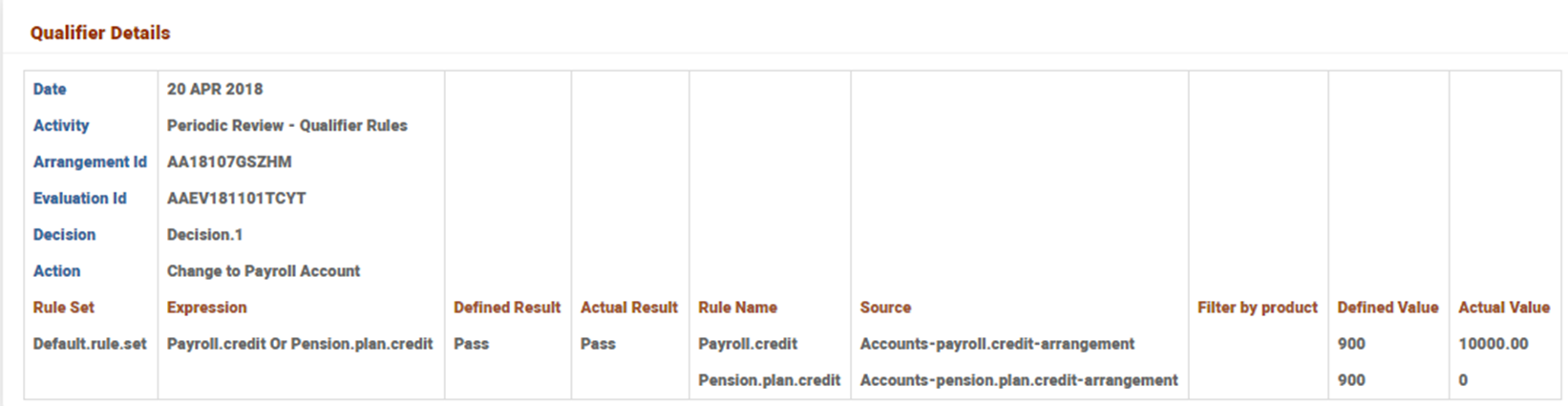 - The below example shows the product Qualifier rule defined to trigger a change Product activity (Current account to a Payroll account) when an arrangement receives an eligible (salary or pension) credit more than 900 USD. The system periodically (say every 3 days) evaluates this rule.