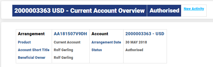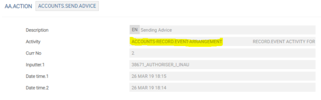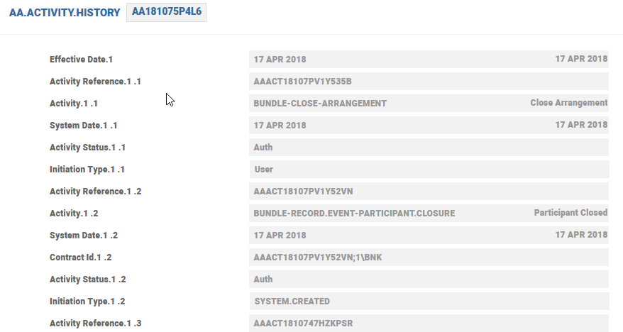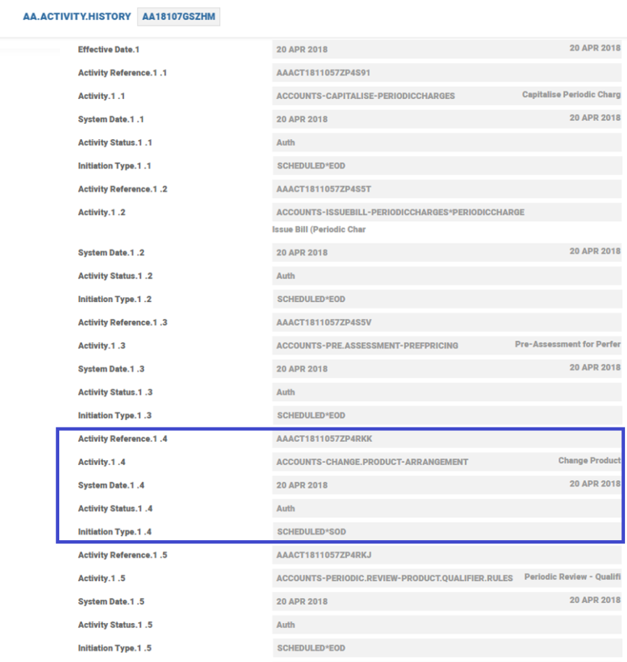 - The below screenshot displays the activity executed for the evaluation date in the AA.ACIVITY.HISTORY record.