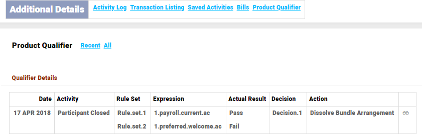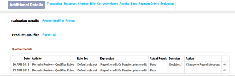 | 20 April 2018 | 1st Qualifier review COB | Current account changed to Payroll account | The Change Product activity was executed by the system based on the evaluation rules |