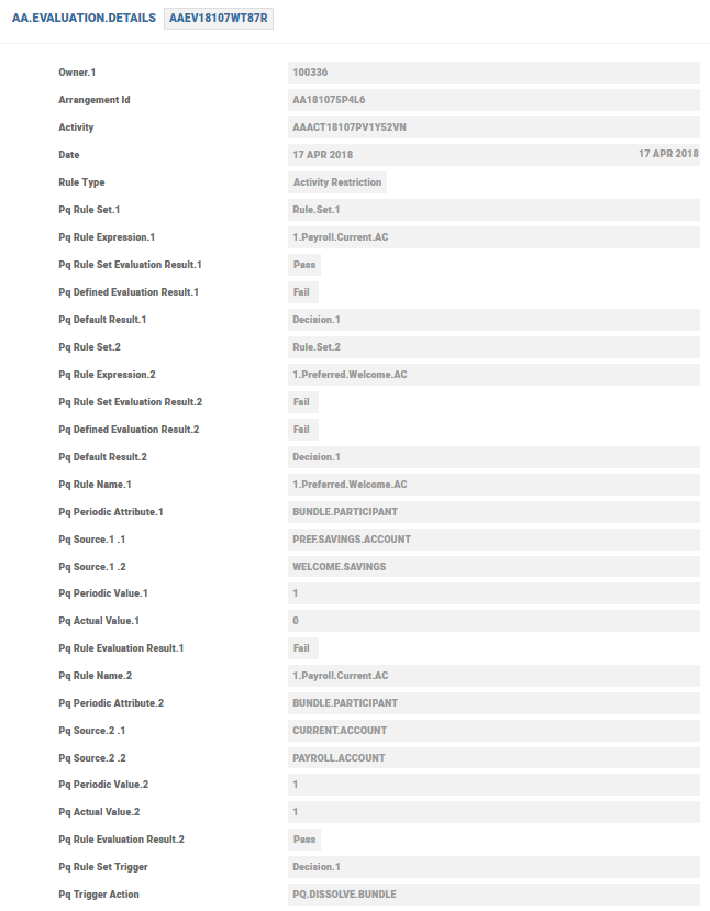 - Evaluation details for all the three rule sets are logged in AA.EVALUATION.DETAILS record.