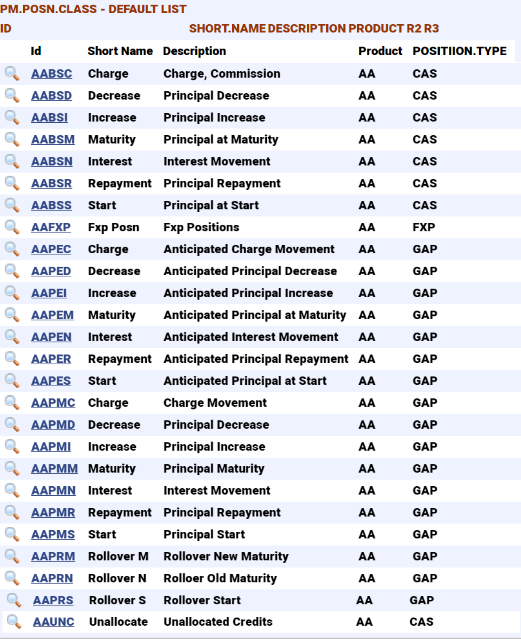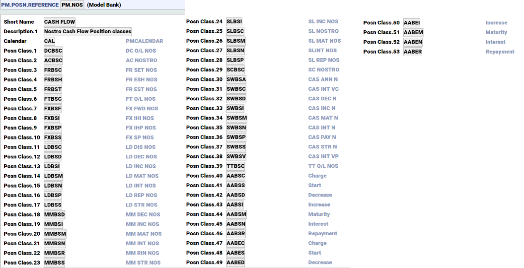 The difference between mandatory and optional position classes is the fourth character in a Position class which is always “E” for optional position class. The system has the intelligence to use either optional or mandatory position classes based on the certainty about principal funding or disbursal dates. Both the Position classes have to be defined in PM.POSN.CLASS and also included in CAS and GAP records in PM.POSN.REFERENCE, if the PM user opts to include the optional position classes also in PM projections. For example, if the mandatory position class is built with AAPMS (Start event for a loan or deposit with timing certainty) an optional position class is built with AAPES (start event with no timing certainty).