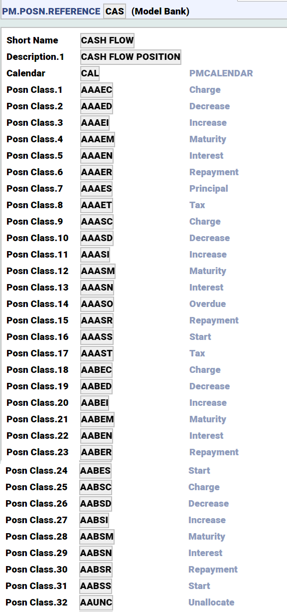 POS.CLASS.REPAYMENT - The Pos Class.1 Repay field specifies the Position Class to which the user wants to relate the Principal Instalment Payment event (a loan instalment or a savings plan instalment). If AAPMR is the position class defined for GAP, then the Position class for CAS is derived as AAXXR (XX is taken from the position class defined in PM.AC.PARAM for the category code of the settlement account). The value must exist in PM.POSN.CLASS and mandatory for Principal Property Class or Property.
