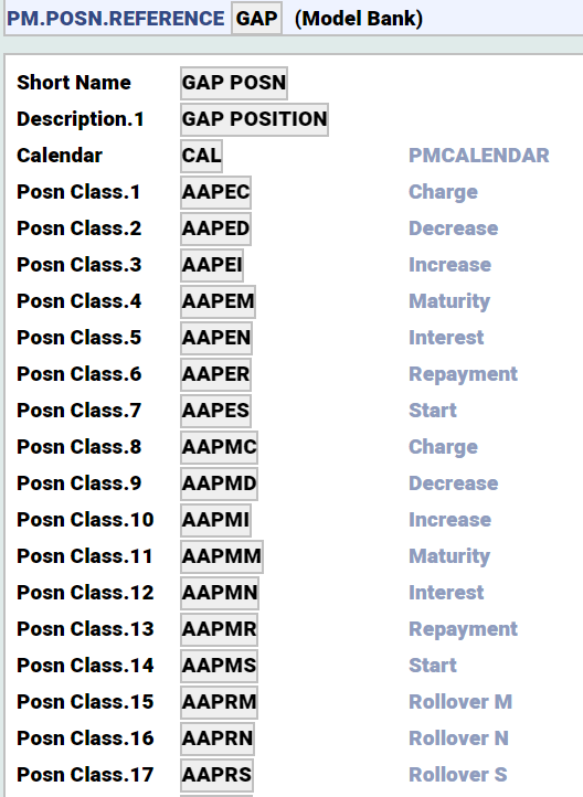 POS.CLASS.MATURITY - PM Position Class for Principal Maturity event for GAP is specified in Pos Class.1 Maturity field. The value must exist in PM.POSN.CLASS and mandatory for Principal Property Class or Property. From the Position class defined here, the Position class for Start event for CAS is derived by replacing the 3rd and 4th characters with those of the Position class defined for the category code of the settlement account in PM.AC.PARAM. The Position classes built for maturity , displays the 4th Character as E, where the timing for disbursal or funding event is not certain.