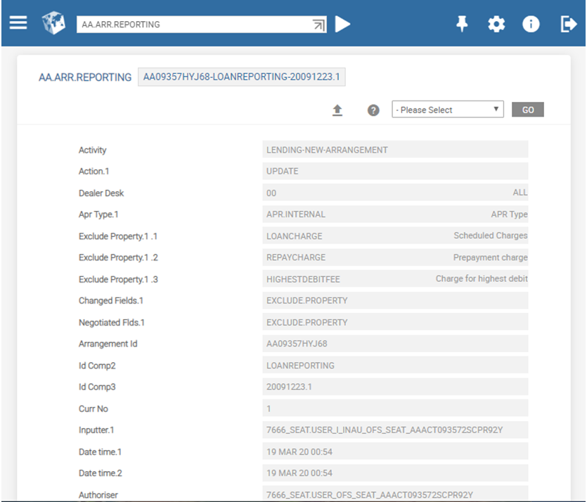 The following screenshot shows the Apr Type field (in the AA.ARR.REPORTING application) set as APR.INTERNAL.