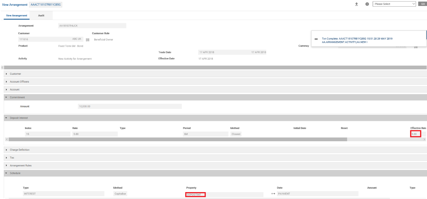 When a savings account is opened based on the above setup, the APR is arrived at 2.52 and presented in the arrangement overview.