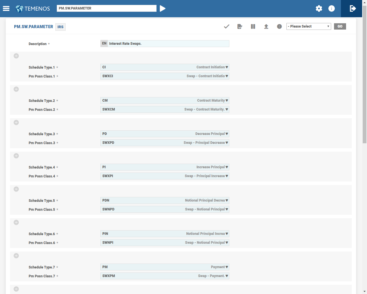 Position classes are the most basic definition for types of events or activities relevant in the management of position risk. For example, a single position class can define principal movements at the beginning of loans and deposits. The Position Management application assigns all business activities recorded in Temenos Transact to a position class. This identifier is then used when building the customised position management reports and enquiries to allocate the activity to its correct position.