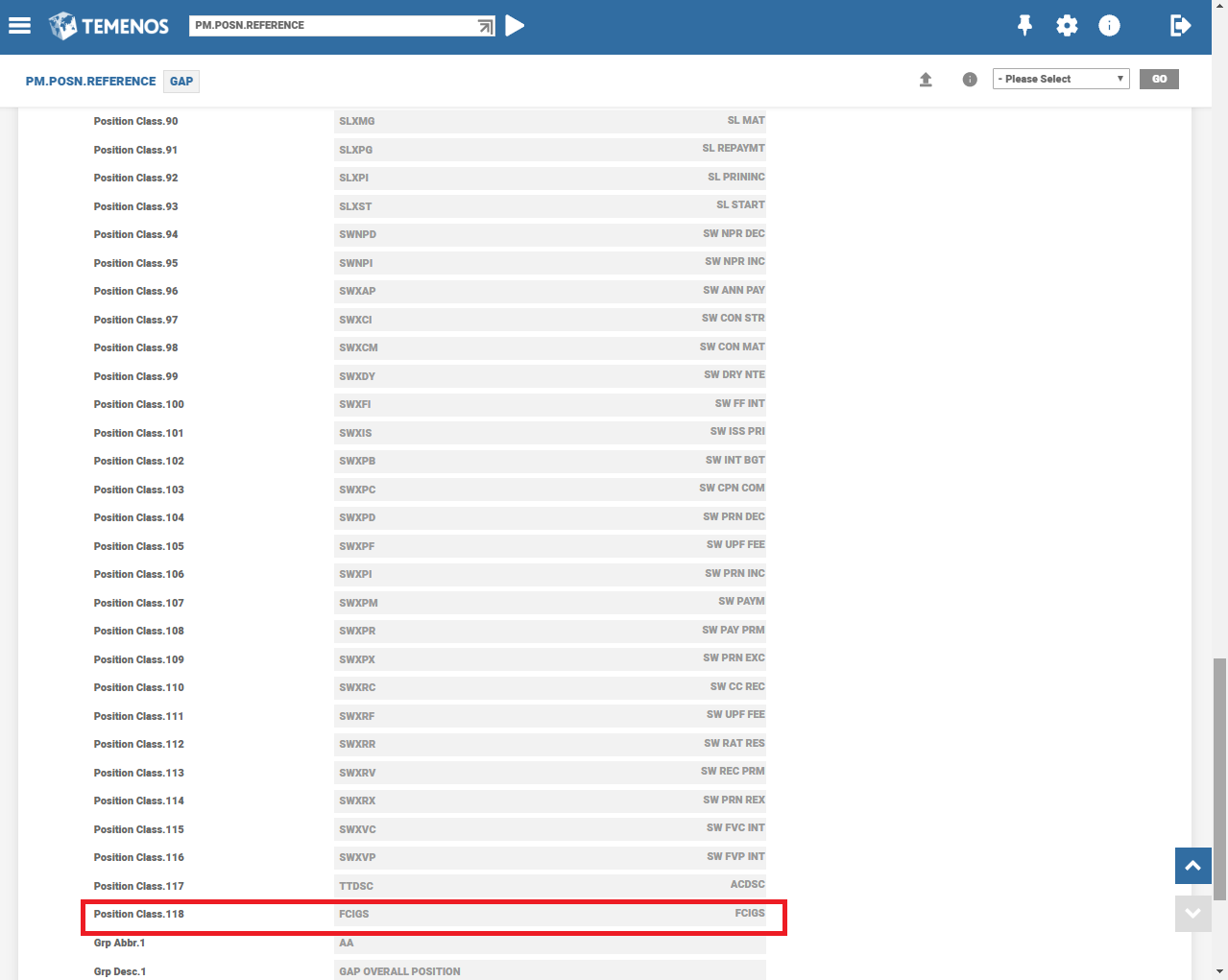 The following table has the sample Position classes for AA to PM. The user can define the GAP and CAS Position classes relating to UNC, overdue, tax and FXP position class.