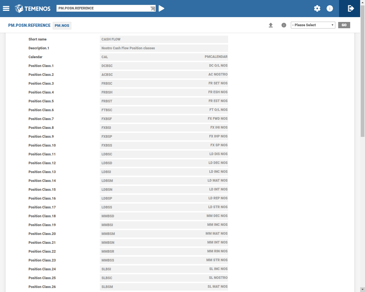 The PM.NOS enquiry shows the cash flow pertaining to the Nostro accounts. Therefore, only the Position classes relating to Nostro account are included. The following Position classes, based on the setup in Model Bank, are included in PM.NOS on account of AA.