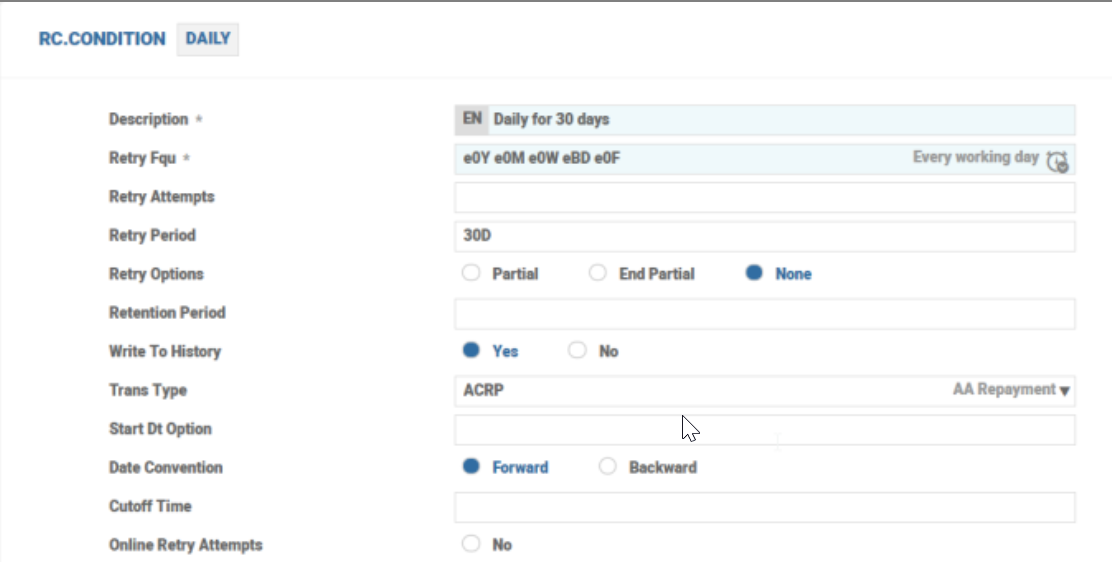 The Date Convention field decides the action for the system when RC date (start, end or next retry date) falls on a holiday. It moves the date to next working date or to the previous working date. The valid values are Forward or Backward and the default value is Forward.