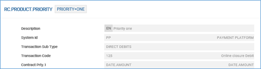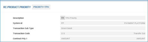 - In the above screenshot, the system is set up to consider the transactions in the following order, if multiple retry requests are posted against the same account:First: Products defined in the RC.PRODUCT.PRIORITY application in the PRIORITY+ONE record (direct debits sent by TPH with transaction code 125).