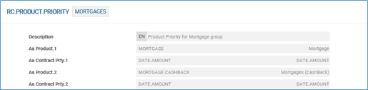 - Second: Products defined in the RC.PRODUCT.PRIORITY application in the MORTAGES record (MORTGAGE AA Product and then MORTGAGE.CASHBACK AA Product).