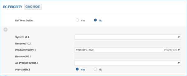 Def Prev Settle is a filtering rule that means if, out of a list of ‘n’ pending transactions, one of transactions could not be settled (during retry), then all subsequent pending transactions in that list will be abandoned. It could be set to either Yes or No or left blank. If selected, it is applicable for EB.SYSTEM.ID, AA.PRODUCT.GROUP or Product Priority. This field is mutually exclusive with Prev Settle field.