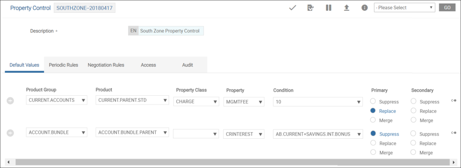 - Merge: The system merges the associated Property or Property Class condition with the condition defined at the Bundle for the same Property in all secondary arrangements. This option is supported only for Pricing Rule and Periodic Charges. This option is restricted for Charges.
