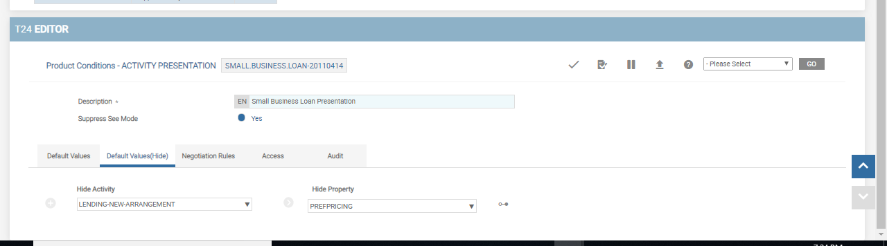 The Activity Presentation Property Class is used to specify the Temenos Transact versions (hereafter referred to as ‘screens’) that can be used when displaying an AA.ARRANGEMENT.ACTIVITY. By specifying screens at the product level, the display of each arrangement activity is controlled dynamically.