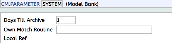 The CM.PARAMETER table contains only a single SYSTEM Record. It defines the number of days a message should stay on the system once it is matched and is archived to the history file.