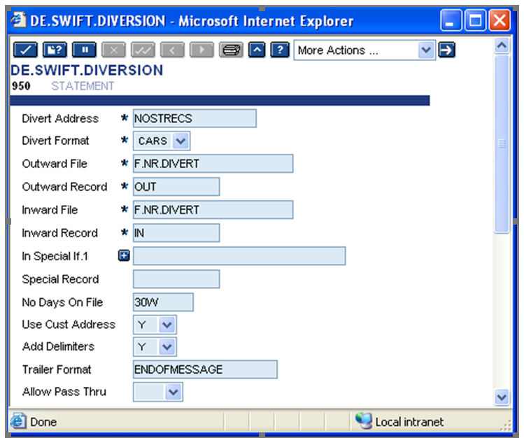 The DE.SWIFT.DIVERSION application enables both inward and outward message to divert SWIFT message for given SWIFT message type and SWIFT address from SWIFT carrier to another file. The inward parameter is used to divert a copy of all incoming MT950 message to IN record in F.NR.DIVERT. If the user is diverting a copy of outgoing message for some other purpose, the user can leave the outward parameters unchanged. The outward fields are mandatory. The generic carrier is used to capture outgoing records for reconciliation.